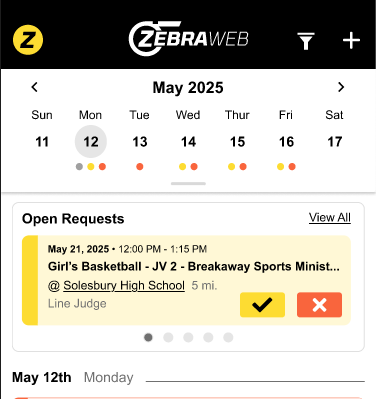 ZebraWeb Mobile allows you to filter your schedule in both Month View and Week View to quickly locate specific games and events.