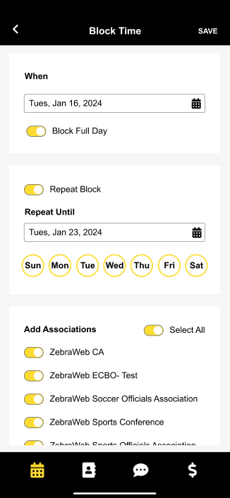 Enter the date and time, and choose whether the block is all day, partial, or recurring.