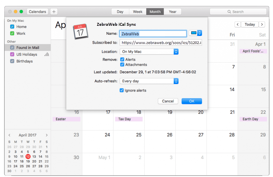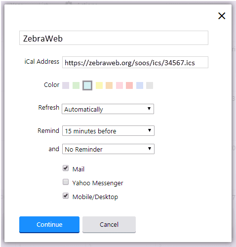 - Enter the URL from ZebraWeb into the iCal Address field and select Continue. *A Calendar name can also be typed in during this process.*
